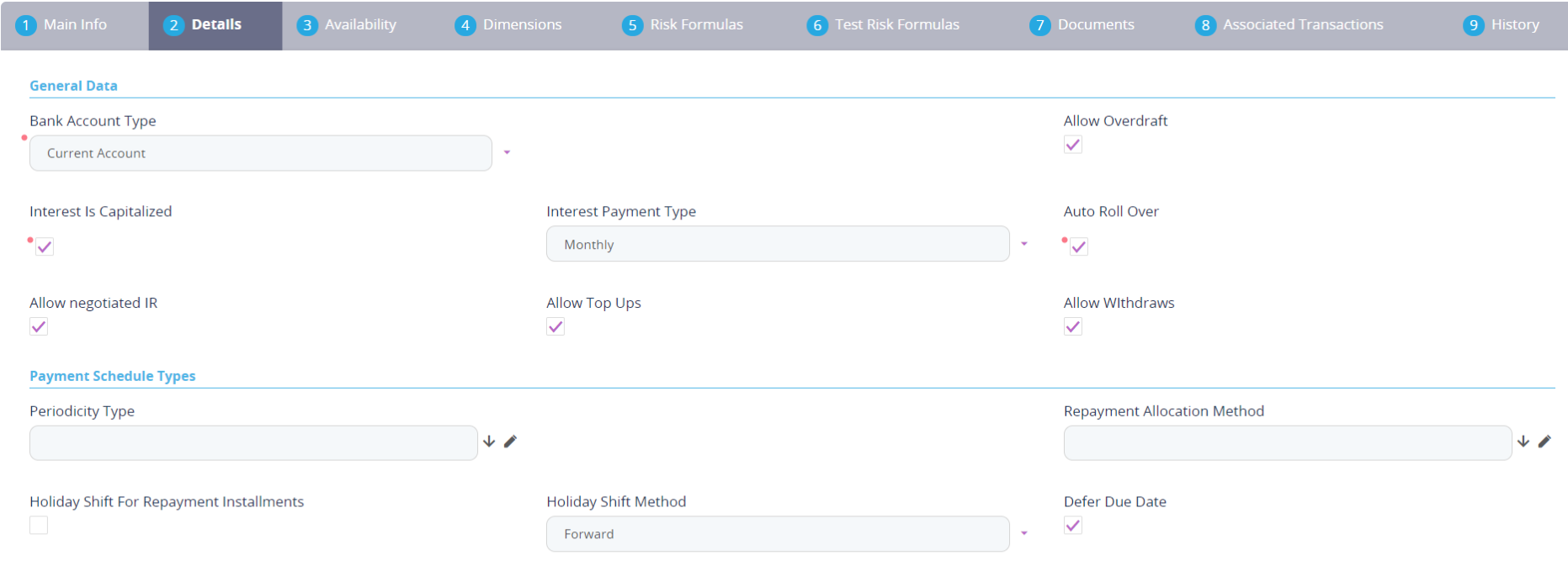 To create a new banking product, click the Insert button on the top right side of the page. A new page opens, with a series of tabs that assist you in configuring the banking product: