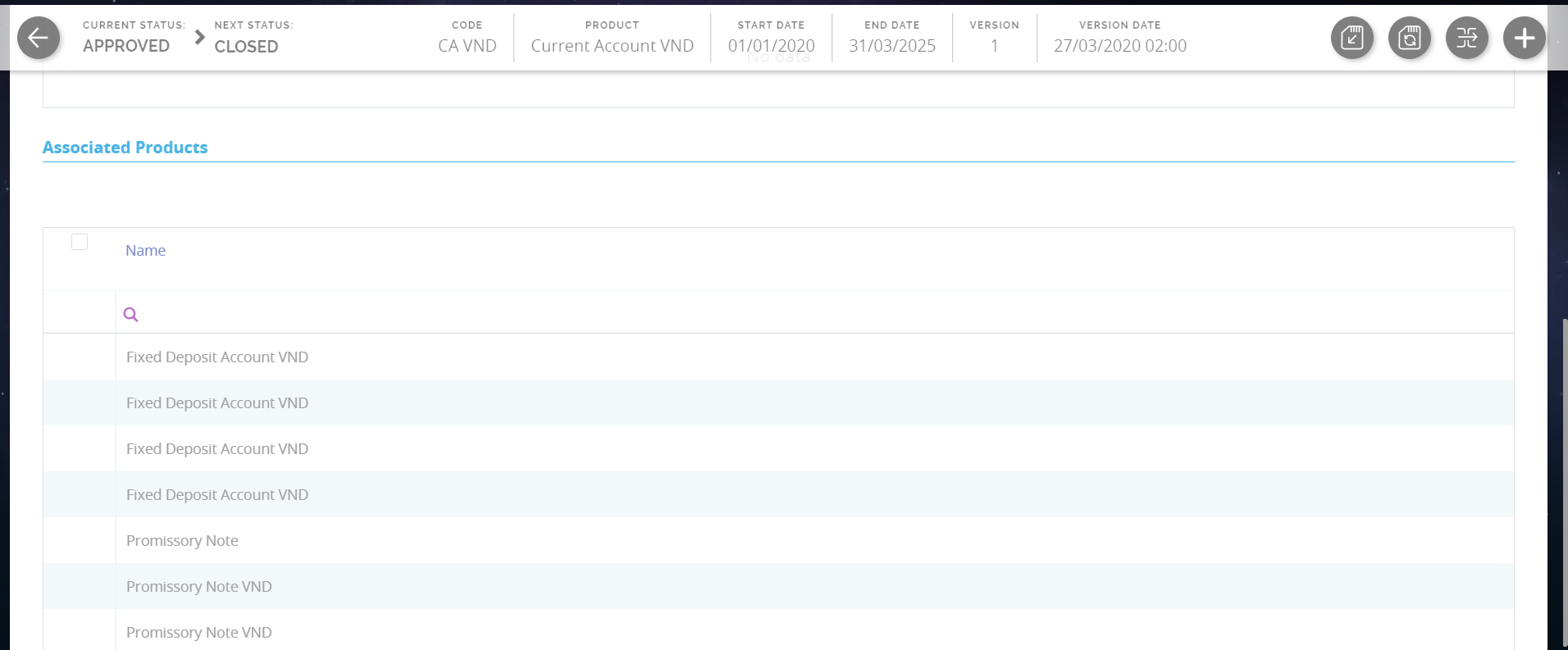 Here you can track the product's life cycle and review older versions that are no longer active (for details, see Banking Products' Life Cycle).