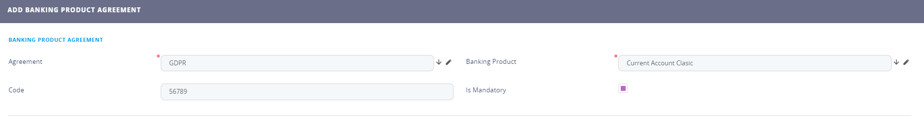 The agreements that a customer needs to go through are displayed in the Banking Products Agreement section. To attach a new agreement to the banking product, click Insert and fill in the following fields: