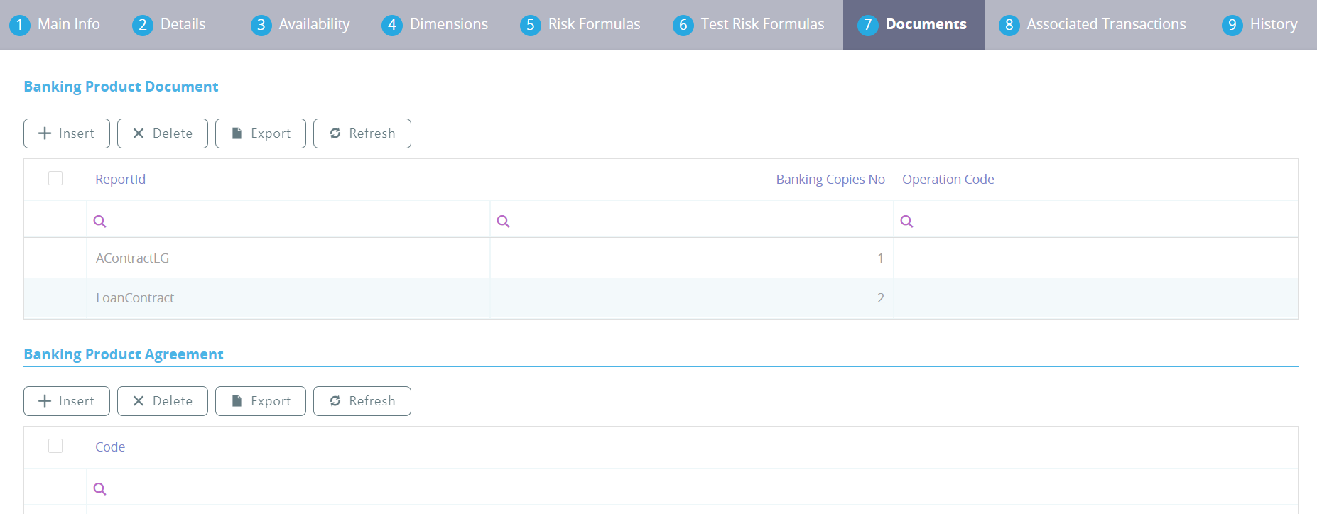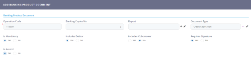 | Banking Product Code | Yes | Text | The code of the product. It can have 10 characters and it is used in the contract. It uses a sequencer and the code of the product type. |