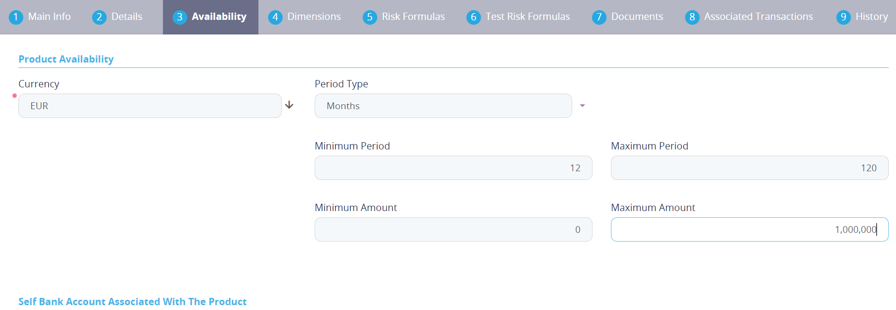 - Availability - This tab determines the monetary range and the time frame when the product is available for customers.