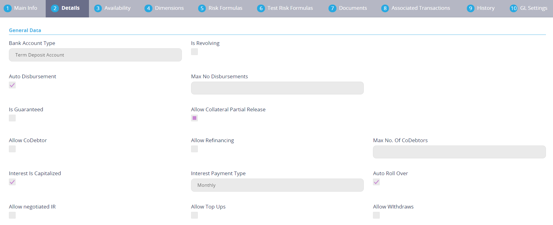 | Auto Rollover | No | Bool | If the checkbox is selected, the contract is renewed at maturity date in exactly the same conditions. If it remains unchecked, the contract is automatically closed at maturity date. The field is used mostly for deposits or any product that can undergo the extension of contract. |