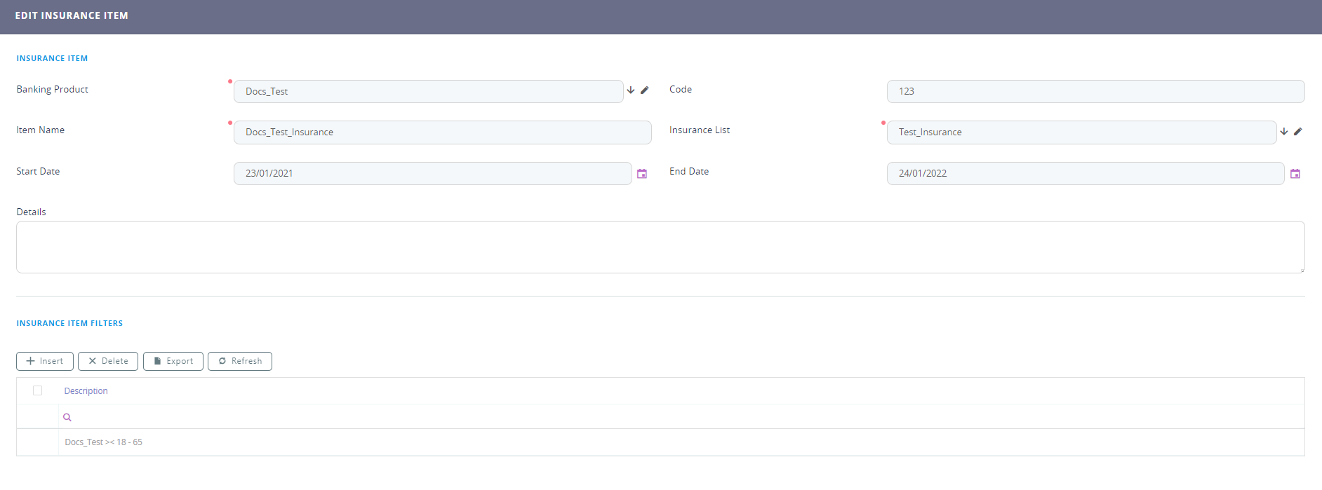 In the Insurance Item Filters section, click Insert and fill in the following fields: