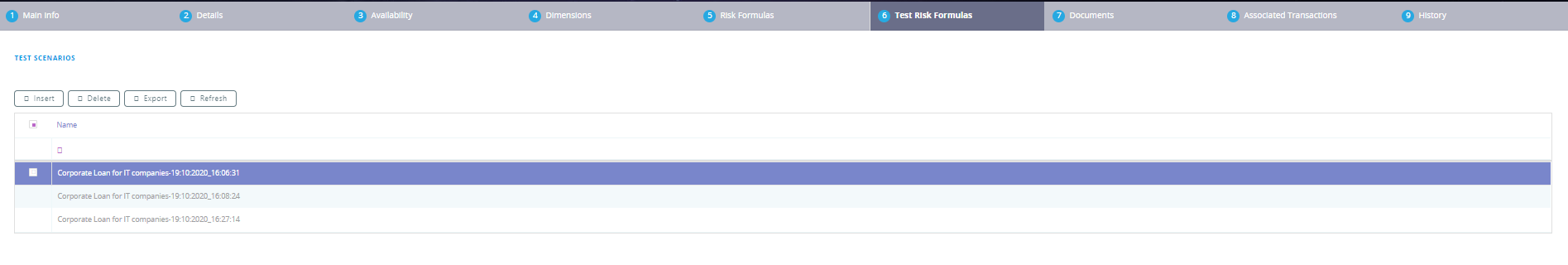 The Risk Formulas tab keeps formulas built with Formula Engine for the banking product. Such formulas can be used to determine the eligibility of a customer.