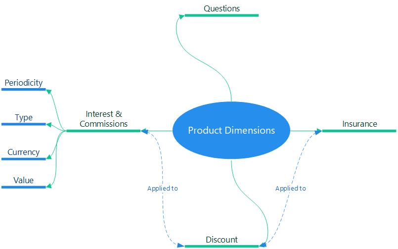 Since inflation affects the interest, it is mandatory to keep track of the changes, to register any new values for the rates and apply them to customers. Commissions are equally important, they represent the fees the bank has for offering a product or service. Fees keep the business going, being a steady flow of money to the bank's revenue. To stay competitive, banks apply discounts to the two mentioned above. For contracting a loan, for example, a customer takes on an insurance. This insurance is part of the product dimensions. Lastly, to determine important details about a customer when they are applying for a product, it is important to have questions for the "Know Your Customer" process to determine their eligibility.
