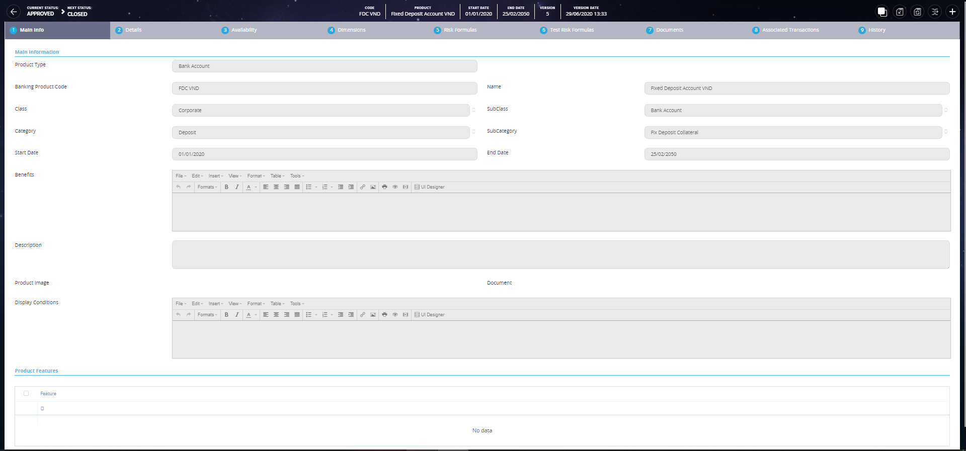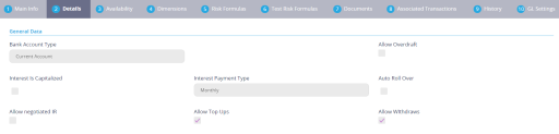 Active status, you can't change any of their related entities (such as features, discounts, product guarantee, interest or commission item, formula, test scenario, product covenant, product disbursement, product availability item filter). To change any of the product's related entities, create a new version of the banking product record.Creating Bank Accounts