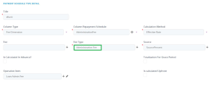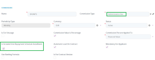 Is Included Into Repayment Schedule Installmentcheckbox for a commission and thePeriodicity Typeis different thanOnce, then the commission is included into the repayment schedule. Note that the repayment schedule should be provided with a column to place the commission.Let's say you define an Administration Fee or a Management Fee with the