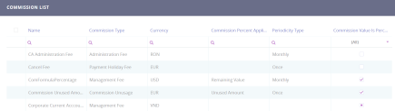 | Is For Unusage | Bool | Select this checkbox if the commission is applied for amount unused from the contract's amount. Usually this commission is applied for unused overdraft amounts. |