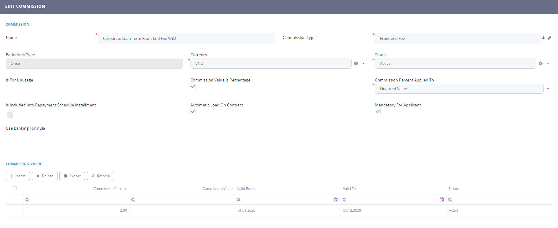 | Mandatory for applicant | Bool | This checkbox makes the commission mandatory to be paid by a customer. If the bank negotiated with a customer to not pay this commission, put the value zero. |