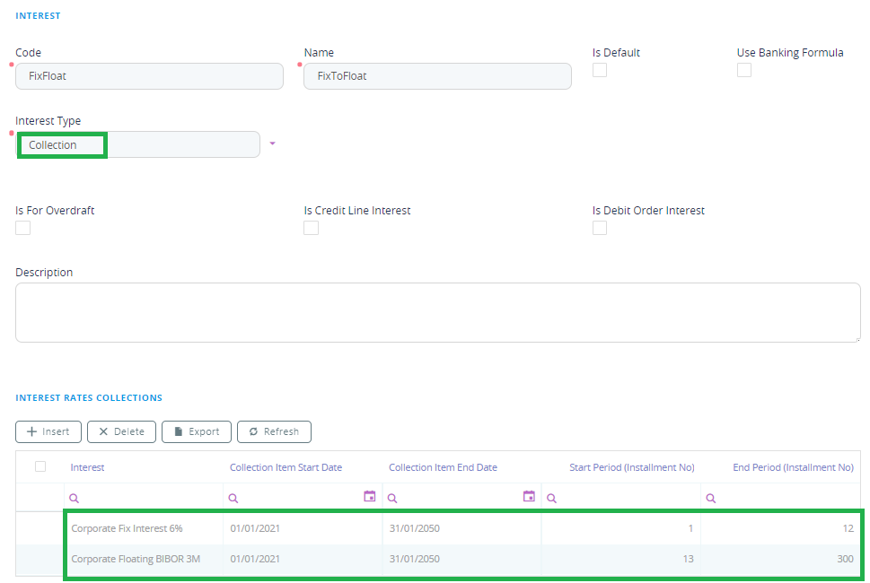 The collection interest is a combination of previously defined fixed and/ or variable interest rates. It can be used for fixed to float interest contracts. The validation of each composing interest is performed on intervals. For example, for a term loan contract, the bank may apply a fixed interest for the first 12 months of the contract, then for the second and third year another fixed interest, and then for the remaining period a variable interest rate.