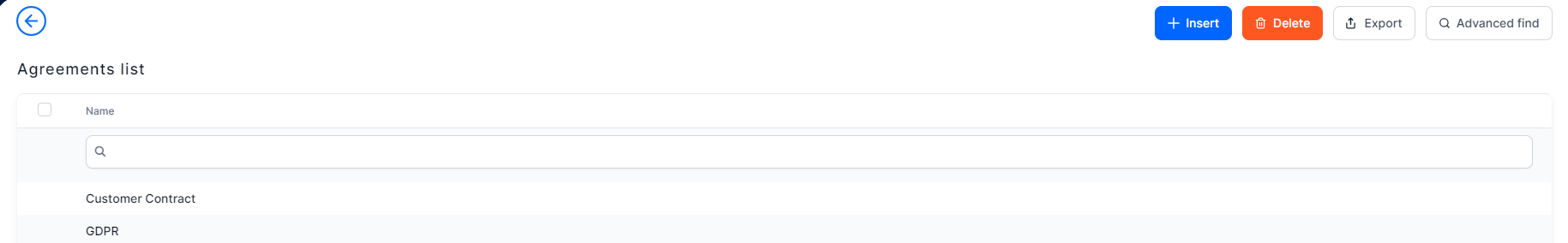 On this page, you can you can add new agreements or edit, delete, export and search existing ones.