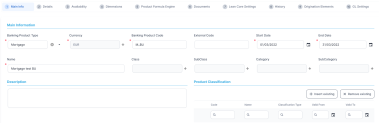 To create a new mortgage loan from scratch, navigate to main menu > Banking Product Factory > Banking Products, and click the Insert button. A new page opens, with a series of tabs that assist you in configuring the banking product. Or, you can create banking products directly from the product category level, allowing Banking Product Factory to automatically fill in the information inherited from the product category.