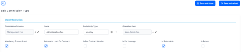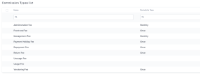 Commission types are used to categorize commissions according to their intended usage. For example, there are administration fee type commissions, front-end fee type commissions, payment holiday fee type commissions, return fee type commissions, and so on.