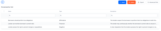 - On the Covenants List page, you can add new covenant record or search, edit, and delete existing ones.