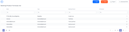 On the Banking Product Formulas list page, you can view the name and type of a banking formula, as well at the associated banking product and its version. Here you can also add new banking product formula records or search, edit, and delete existing ones.