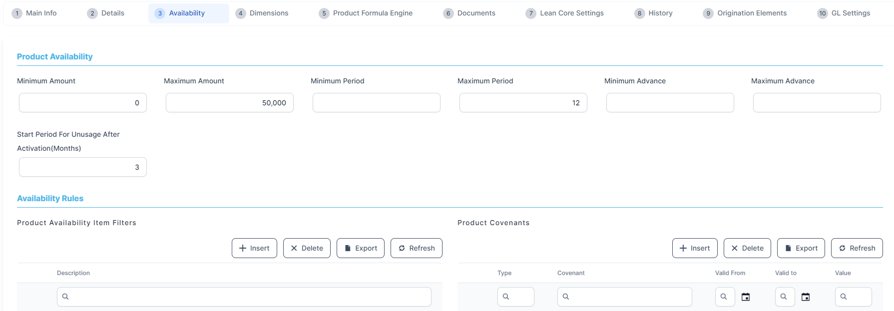 In the Product Covenants section you can set certain conventions that applicants must abide by after getting the loan. This is usually applicable for corporate clients that must meet certain requirements in order to continue to receive disbursements.