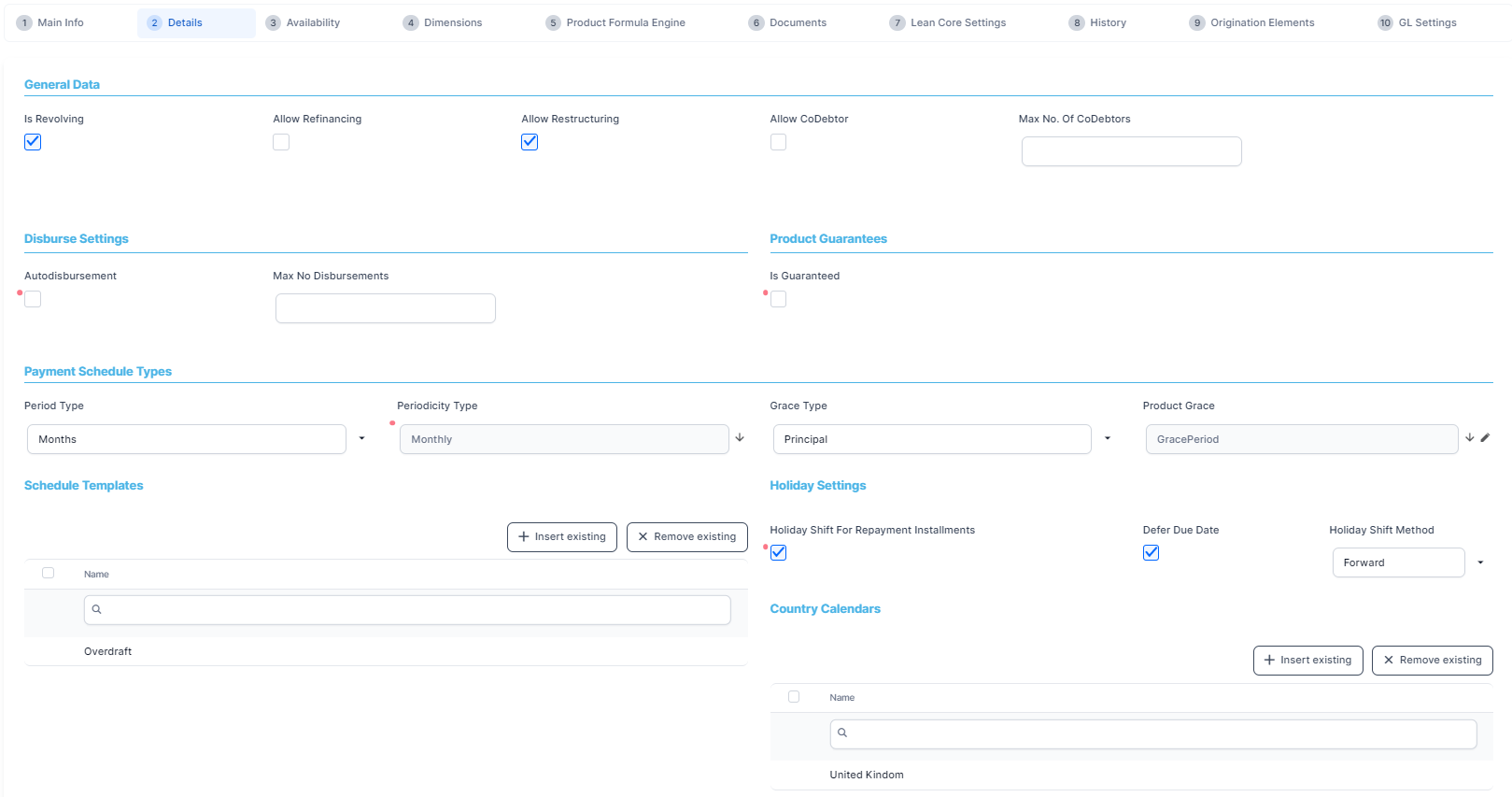 Product Grace: Select an option from the list. This is the amount of time that the bank can offer to a customer at the beginning of the contract without repayments of principal or principal + interest (however, most probably the bank capitalizes the interest for that period).
