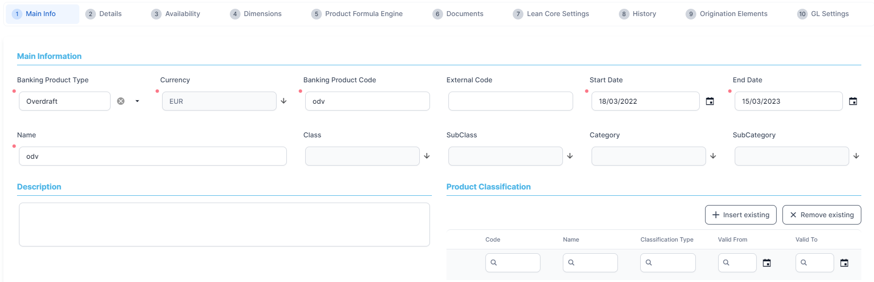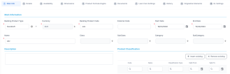 You can set the basic elements for creating the product, such as name, code, currency, validity, or product classification, in the Main Info tab.