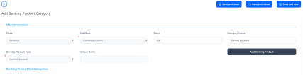 The product category is saved and a unique name for this category is automatically filled in based on the class, subclass, and category name, for example Personal_Current Accounts_Current Account. - You can add a new banking product directly from the Edit Banking Product Category page, if you wish.