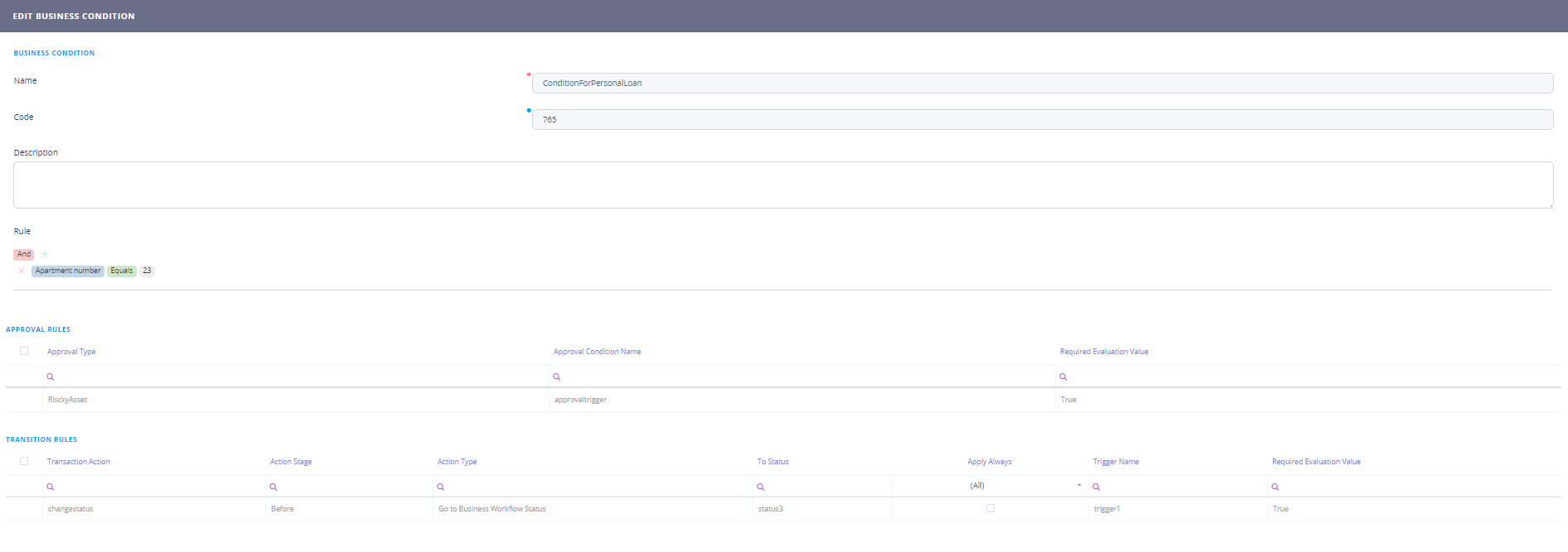 The transition rule opens the EDIT ACTION TRIGGER page. See Edit Workflow Transition Configuration.Both grids will display the two triggers added after the creation of the Business Condition. To modify one, double click on it and the Edit approval trigger or the Edit action trigger page will open.