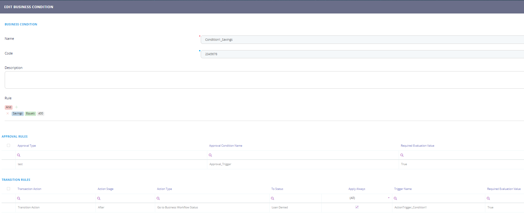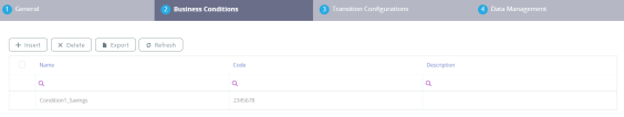 - Click the Insert button. The Add Business Condition page opens. This page can be accessed as well from the main menu as explained in this page Business Rules.