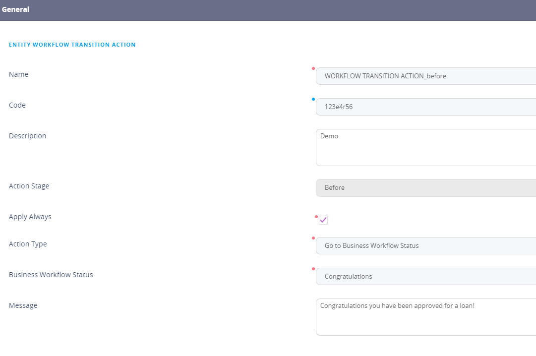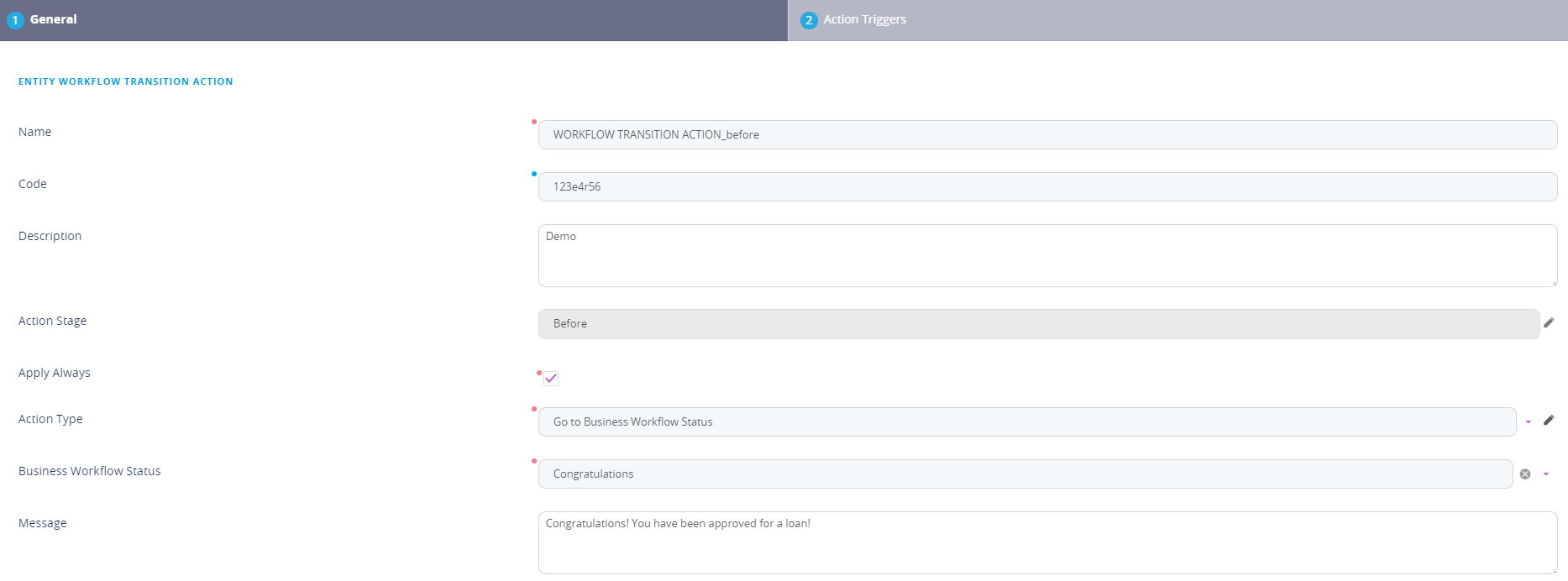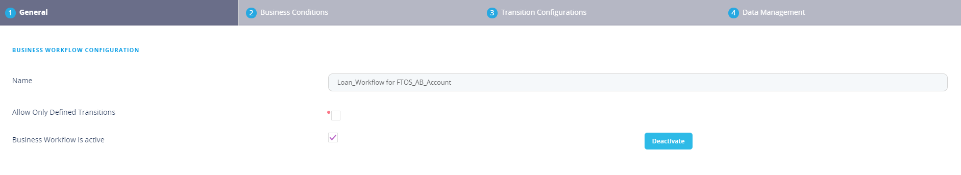 By double-clicking on one of the names from the Business Workflow Configurations List, it opens the following tabs and fields. The name is generated by the system when the workflow is created. The name has the structure: Name of the workflow for the name of the entity, e.g. Loan_Workflow for FTOS_AB_Account.