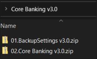 zip file within the CoreBanking_v3.0.zip must be extracted and installed separately, in the given order! -