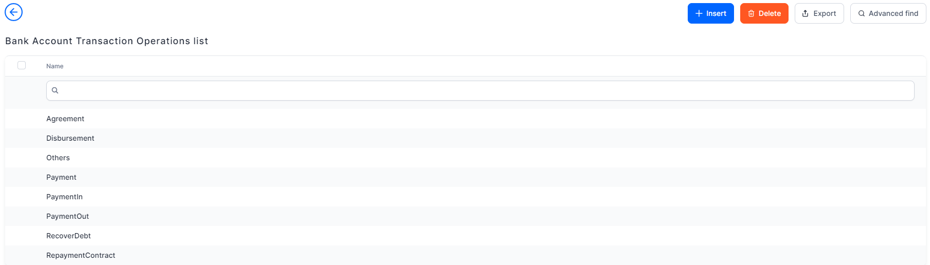 Click Bank Account Transaction Operation menu item to open the Bank Account Transaction Operations List page.