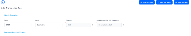 A new section, Transaction Fee Values, is displayed after saving the record. The values of the transaction fee are managed within this section.