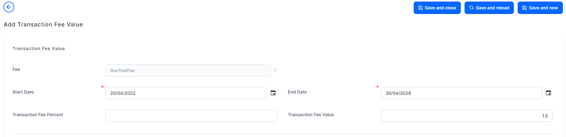 Click the Save and Close button at the top right corner of the page. The new value for the transaction fee is saved.