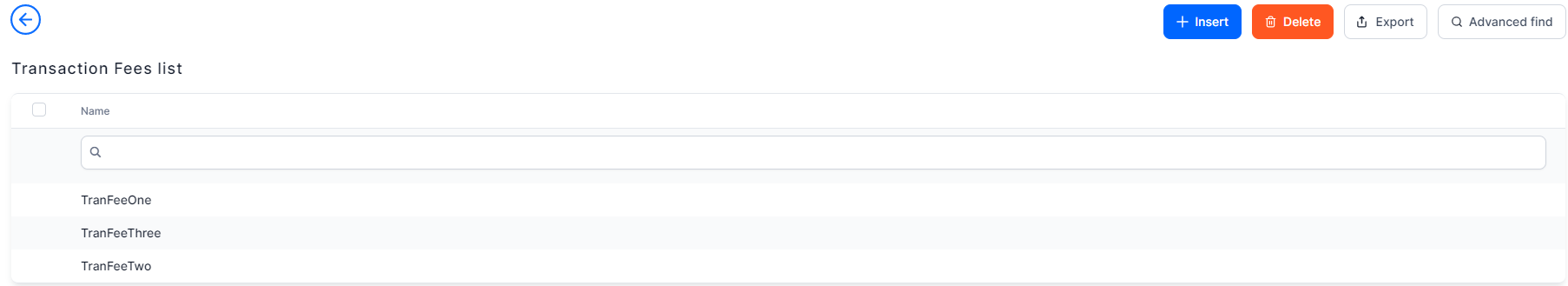 Click Transaction Fee menu item to open the Transaction Fees List page.