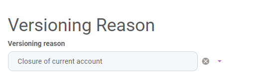 To add a reason for manually creating the new version of the contract, you can select an option from the Versioning reason drop-down. The Closure of current account reason must be selected when the current account with overdraft contract is closed, as it signals Core Banking to perform the procedures needed in order to settle all the costs of the overdraft and of the current account.