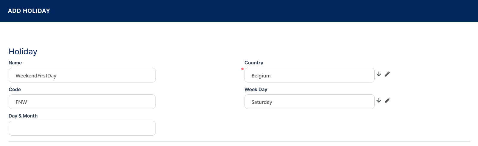 - Day and Month - For holidays with a fixed date, enter the day and month, in the