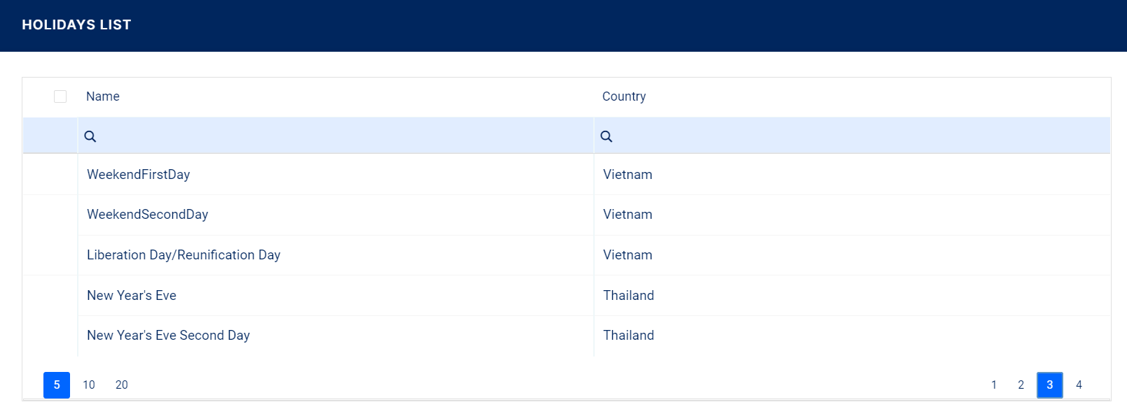 On the Holidays List page, you can add new holiday records or search, edit, and delete existing ones.