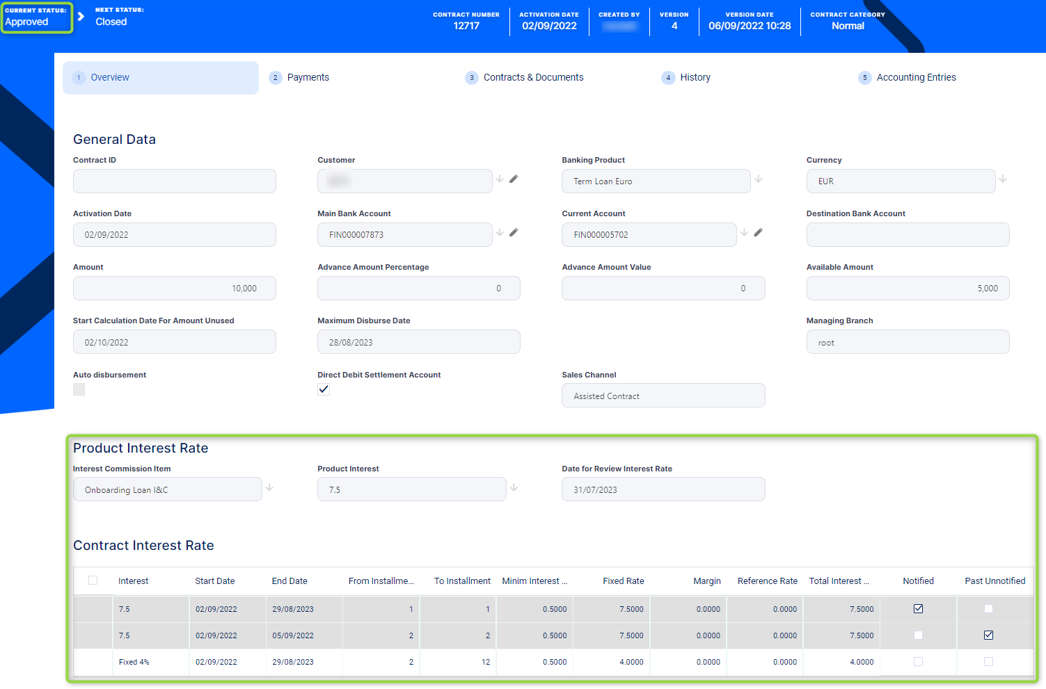 Version Draftstatus, you can change the interest rates either using another definition of interest from those listed in product setup, or modifying the fixed rate, margin, or minimum interest rate, in the Overview tab's Product Interest Rate and Contract Interest Rate sections.For contracts in