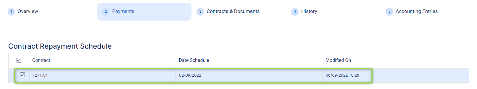 Navigate to the Payments tab -> Contract Repayment Schedule section and double-click the repayment schedule generated for contract version. -