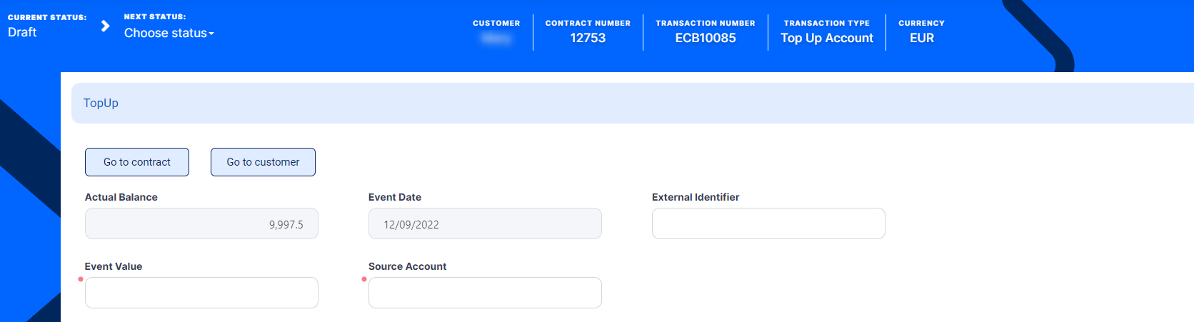 Transaction Type - Select from the list the Top Up Account transaction type. If you can't find it, then the transaction type is not associated with the banking product which is at the base of the contract.