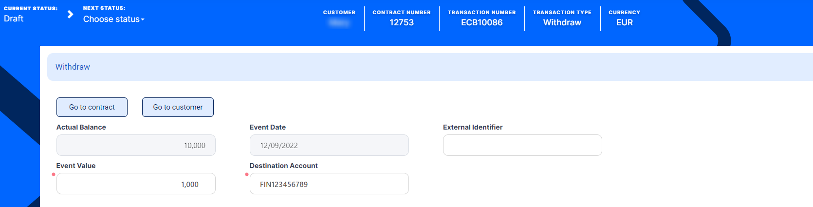 Transaction Type - Select from the list the Withdraw transaction type. If you can't find it, then the transaction type is not associated with the banking product which is at the base of the contract.