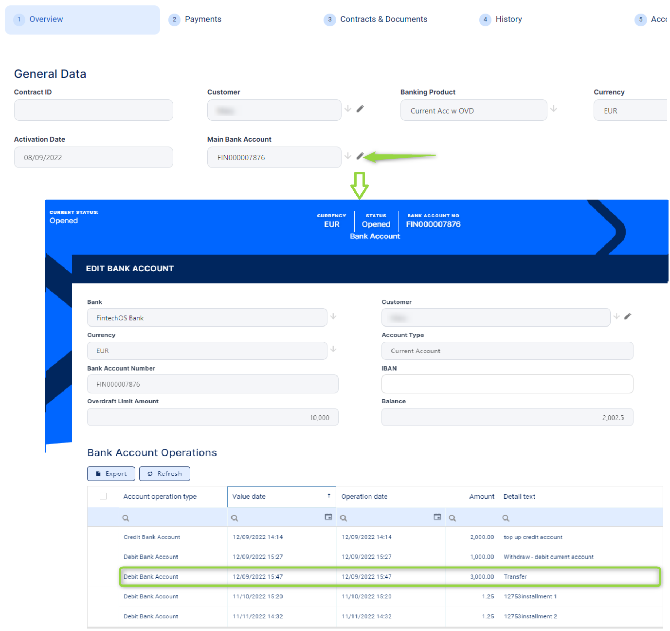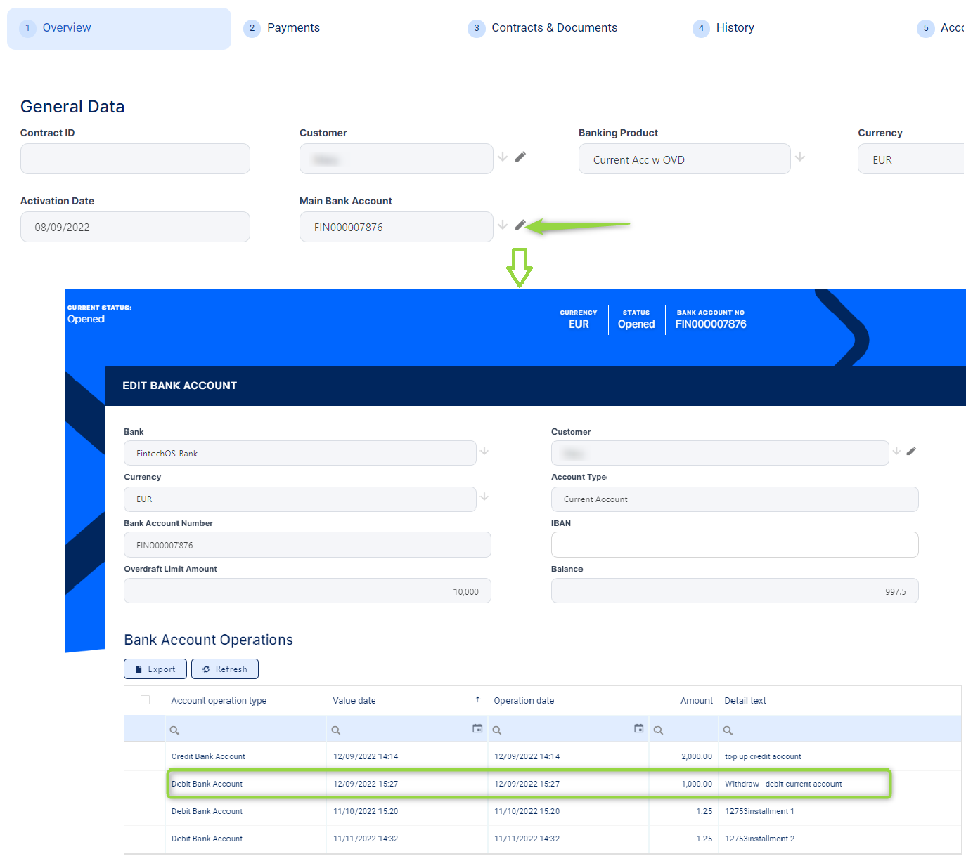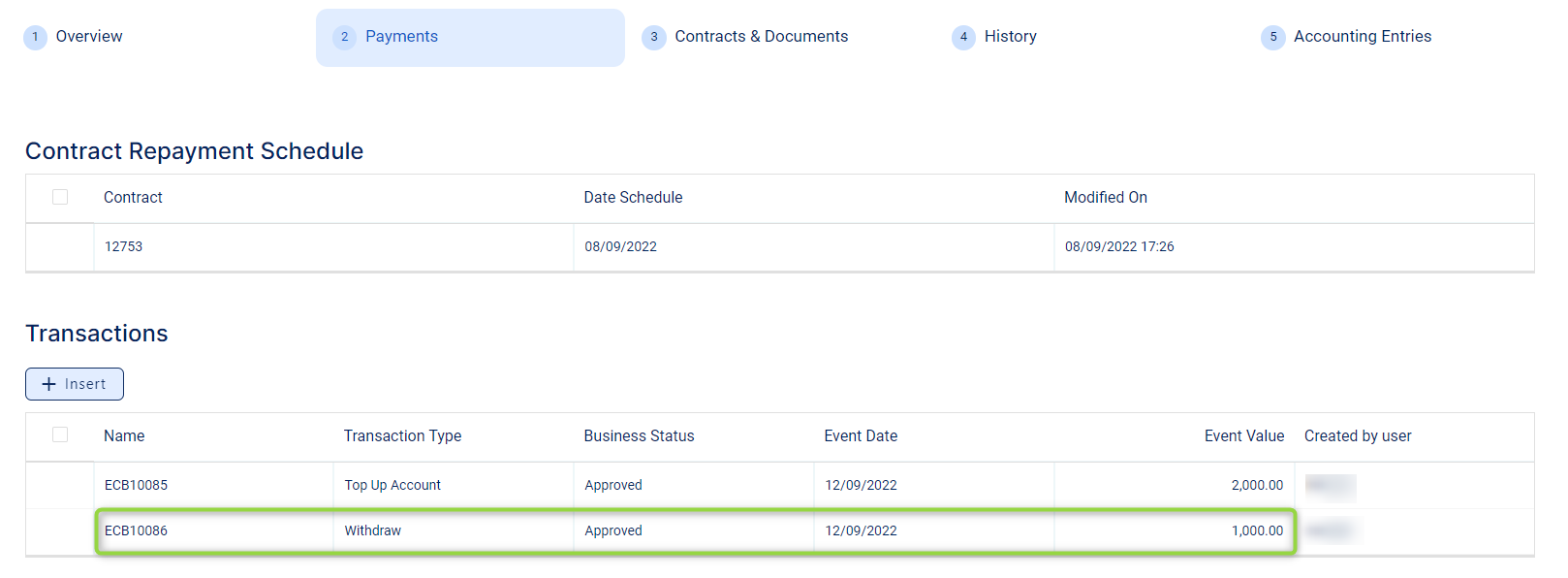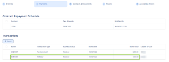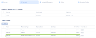 You can find all the existing transactions, payments, penalties, bank account operations, repayment schedules, schedule versions, repayment notifications for a contract on the Payments tab. The tab has no information to display for contracts in Draft status. Approve the contract to perform any transactions on the contract.