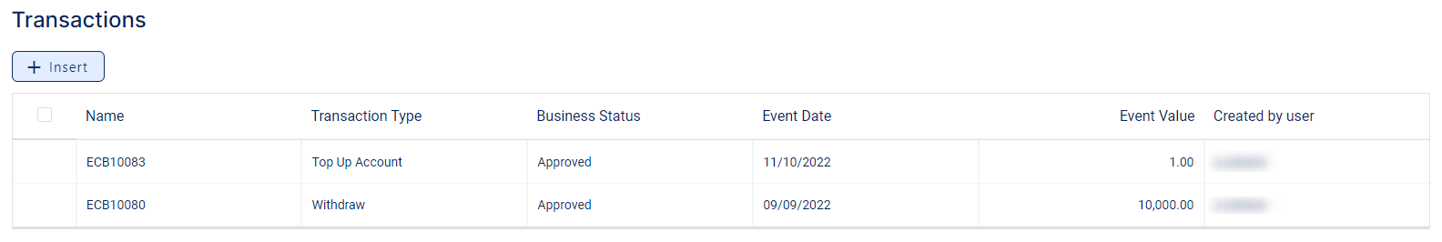 Here you can see only basic information about the transactions, such as event number, status, date, transaction type, value and the user who created it. -
