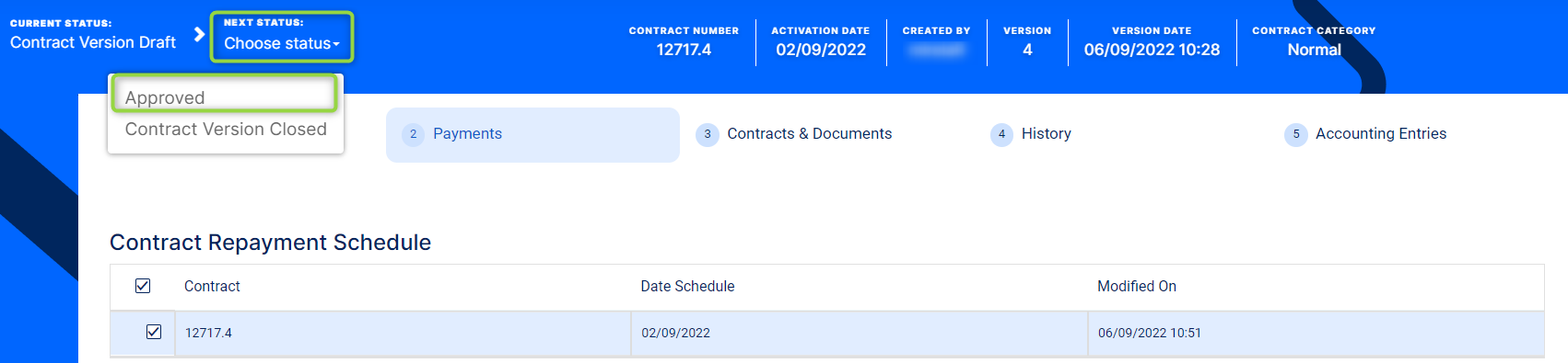 Version Draftstatus, changing its status toApprovedand then confirming your action. Thus, Core Banking applies the new recalculated repayment schedule to the contract. -