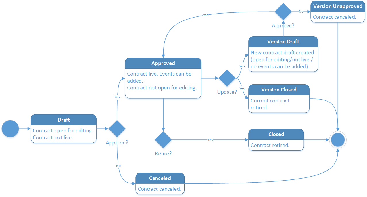 - Every contract version starts in a draft state and must go through an approval process before going live.