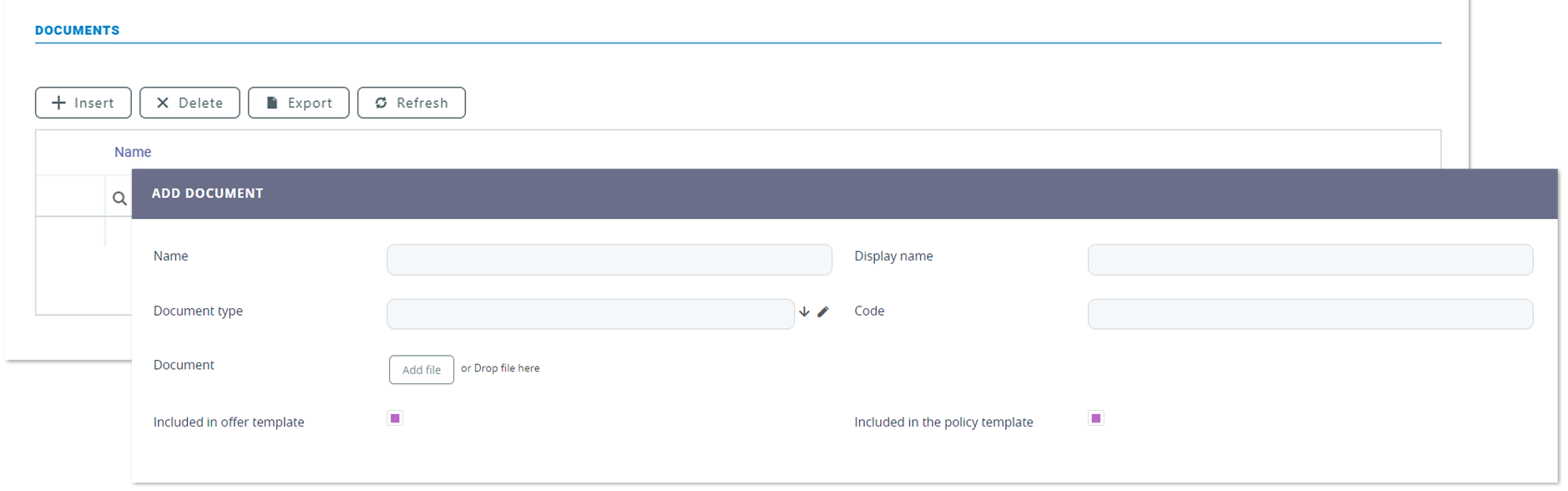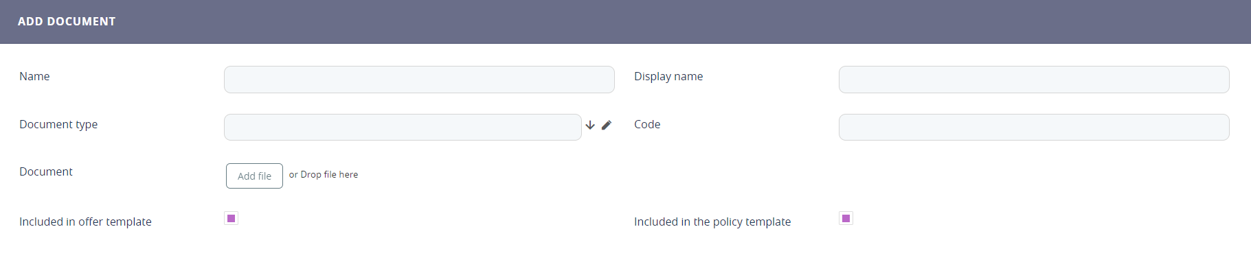 | Document type | From the option set, choose between Policy, Terms & Conditions orIPID - Insurance Product Information Document - which is a type of document presented during the Quote&Apply flow. |