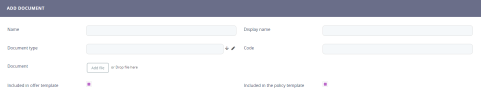 | Document type | From the dropdown, choose between Policy, Terms & Conditions orIPID - Insurance Product Information Document - which is a type of document necessary for the Quote&Apply journeys. |