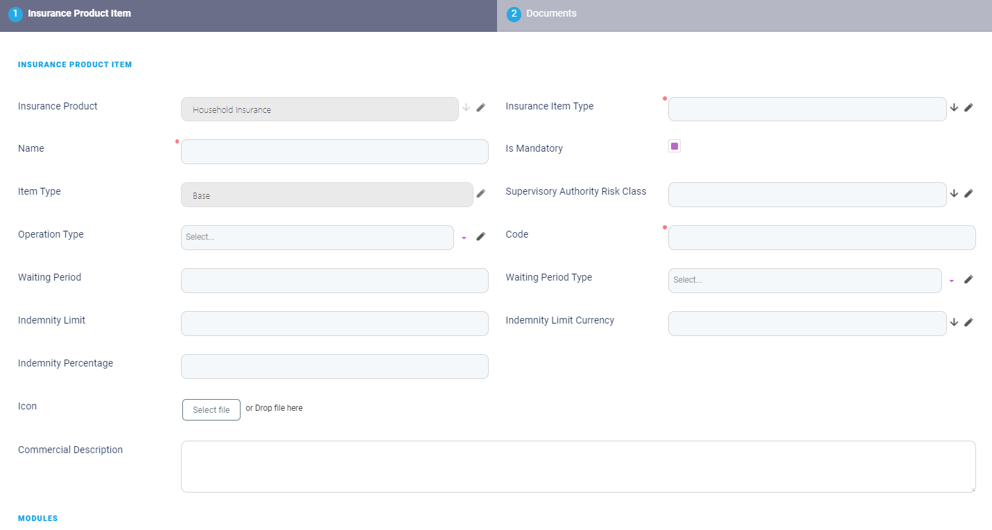 Proceed to insert a Base product item. In the header section of the form, under Insurance Product Items, click Insert. The Insurance Product Item window opens. This form allows you to add any number of base items attached to your insurance product and any relevant documents describing each added item.