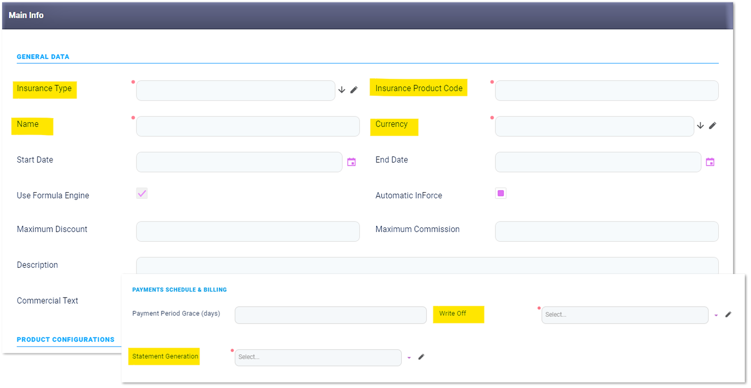 Below is an example of an Insurance Product form, with the mandatory fields highlighted: