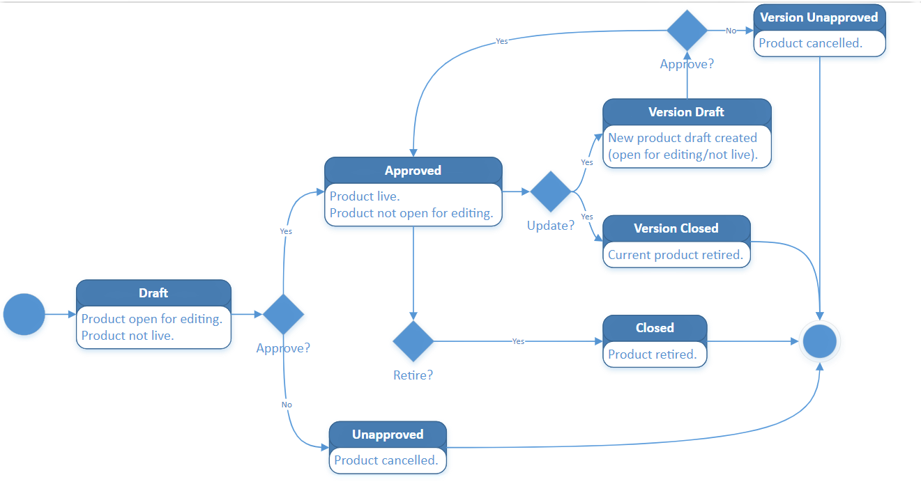 - Every product (or product version) starts in Draft status and must go through an approval process before going live.