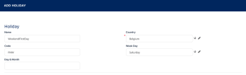 - Week Day - For repetitive holidays, select the weekday on which the holidays falls on.