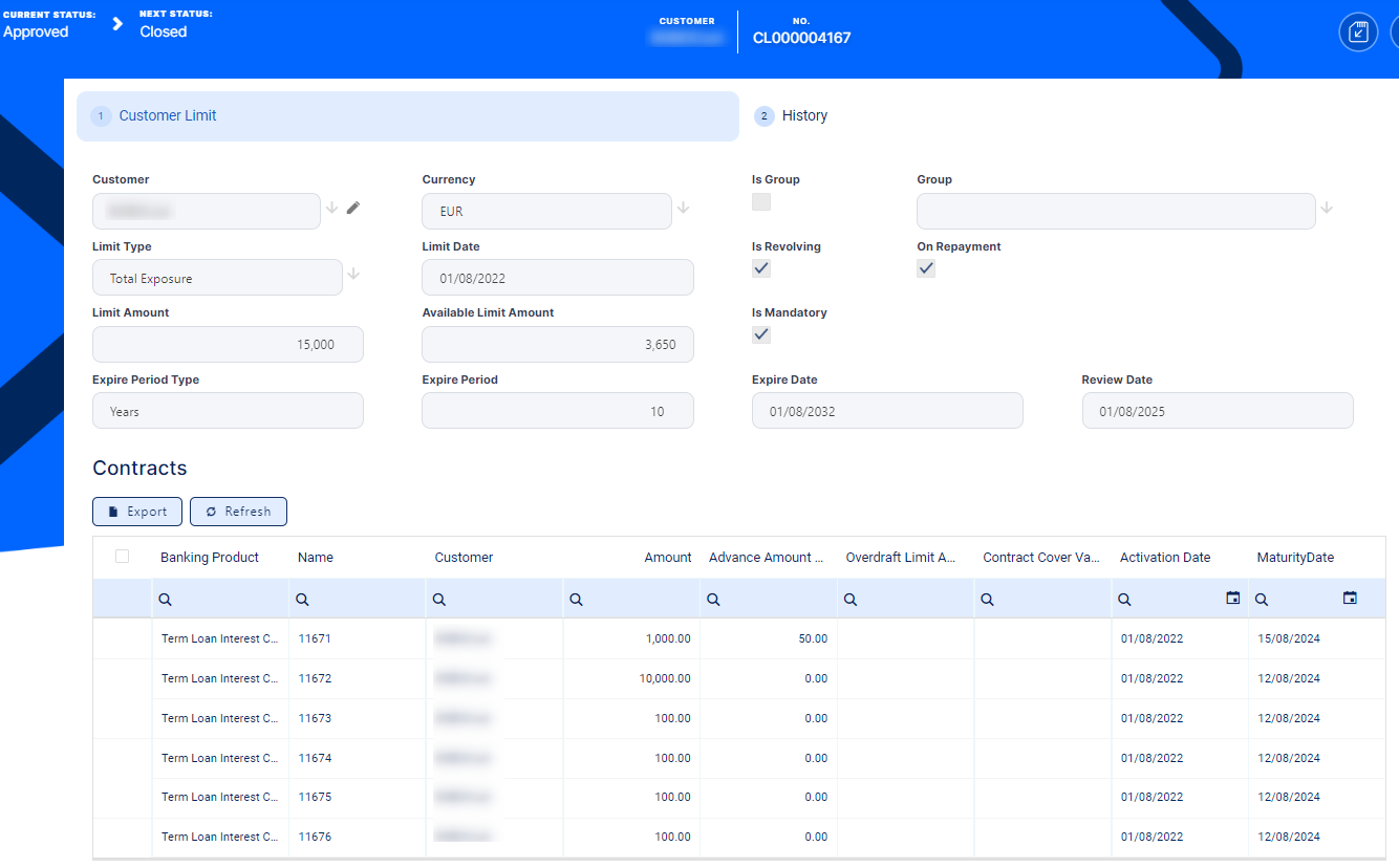 Once you create a limit record, Loan Management automatically identifies it and links the relevant contracts to it, you can see them on the Customer Limit page's Contracts section.