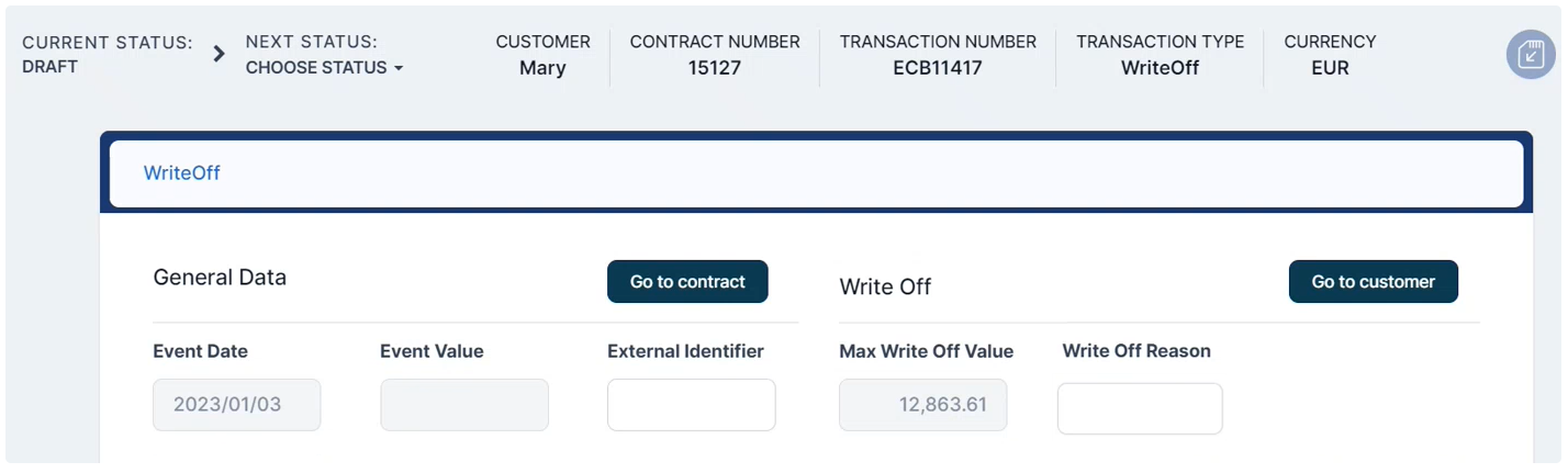 The event is saved in Draft status and a transaction number is automatically generated for it. The Edit Contract Event page corresponding to the selected transaction type is displayed. The contract's maximum possible write-off value is automatically calculated and displayed. You can't edit this field. -